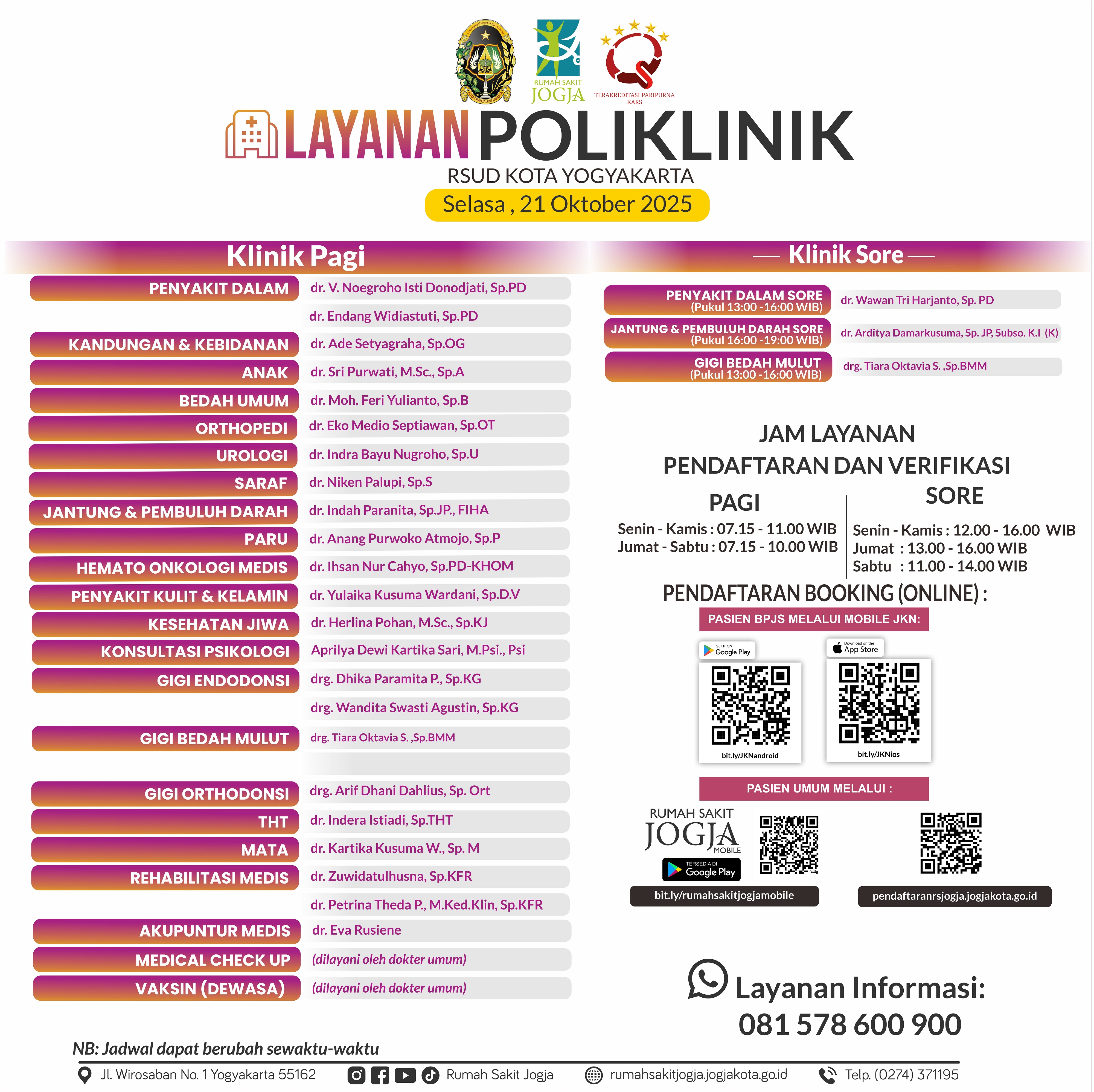Jadwal Layanan Poliklinik Selasa, 21 Oktober 2025