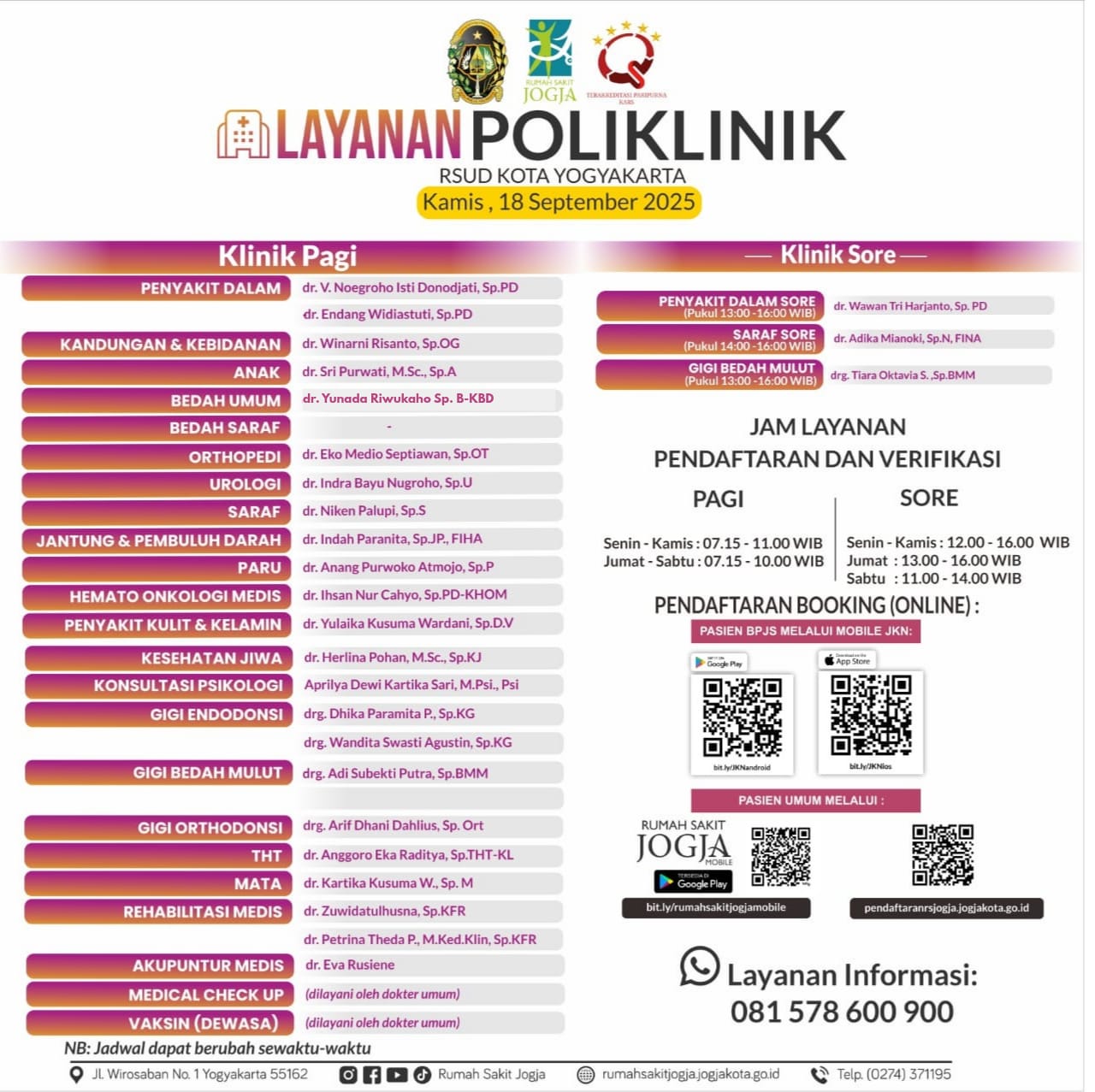 Jadwal Layanan Poliklinik Kamis, 18 September 2025